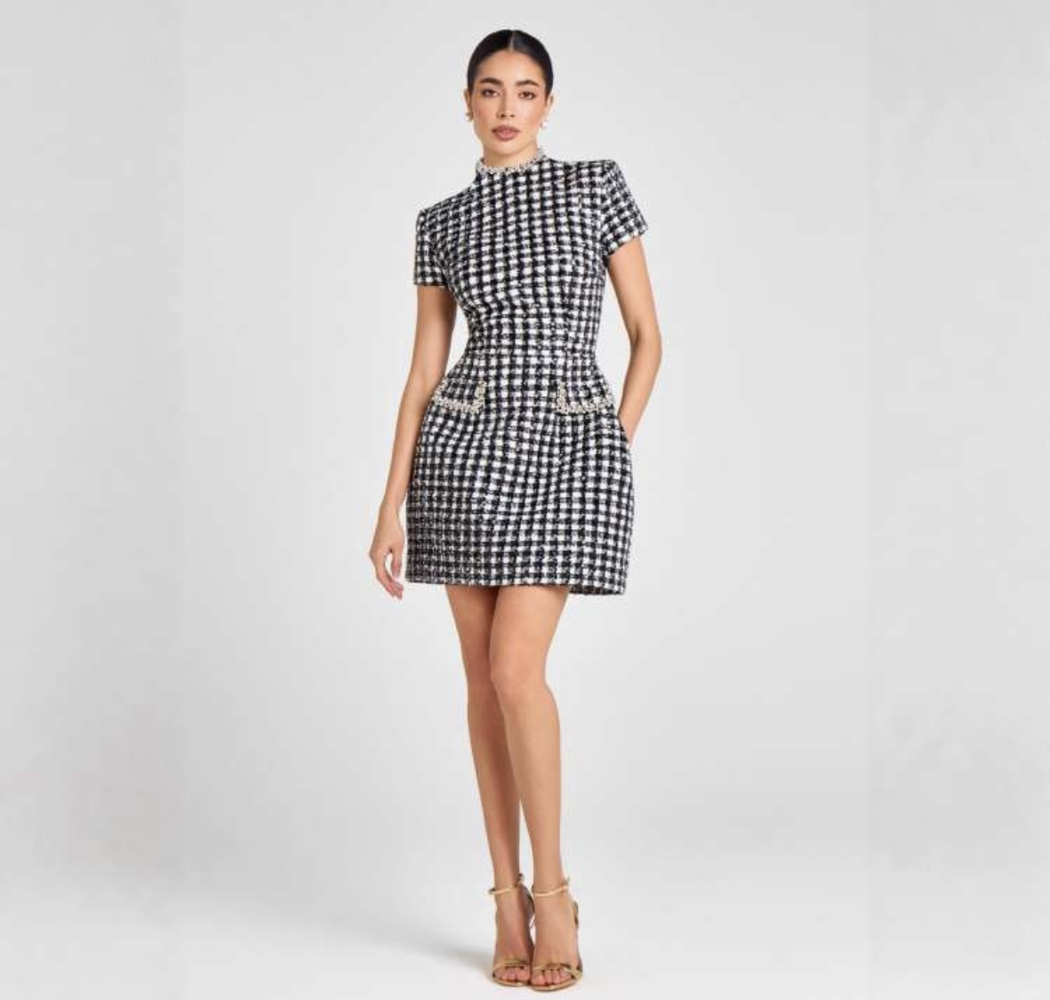 Be the first to review “KATHARINE HOUNDSTOOTH TWEED CRYSTAL EMBELLISHED STRUCTURED DRESS”